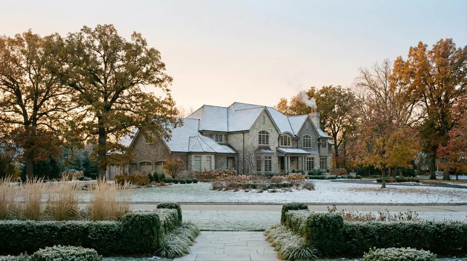 A luxury estate showing the transition of seasons with frosted landscaping and a light dusting of snow on the roof.